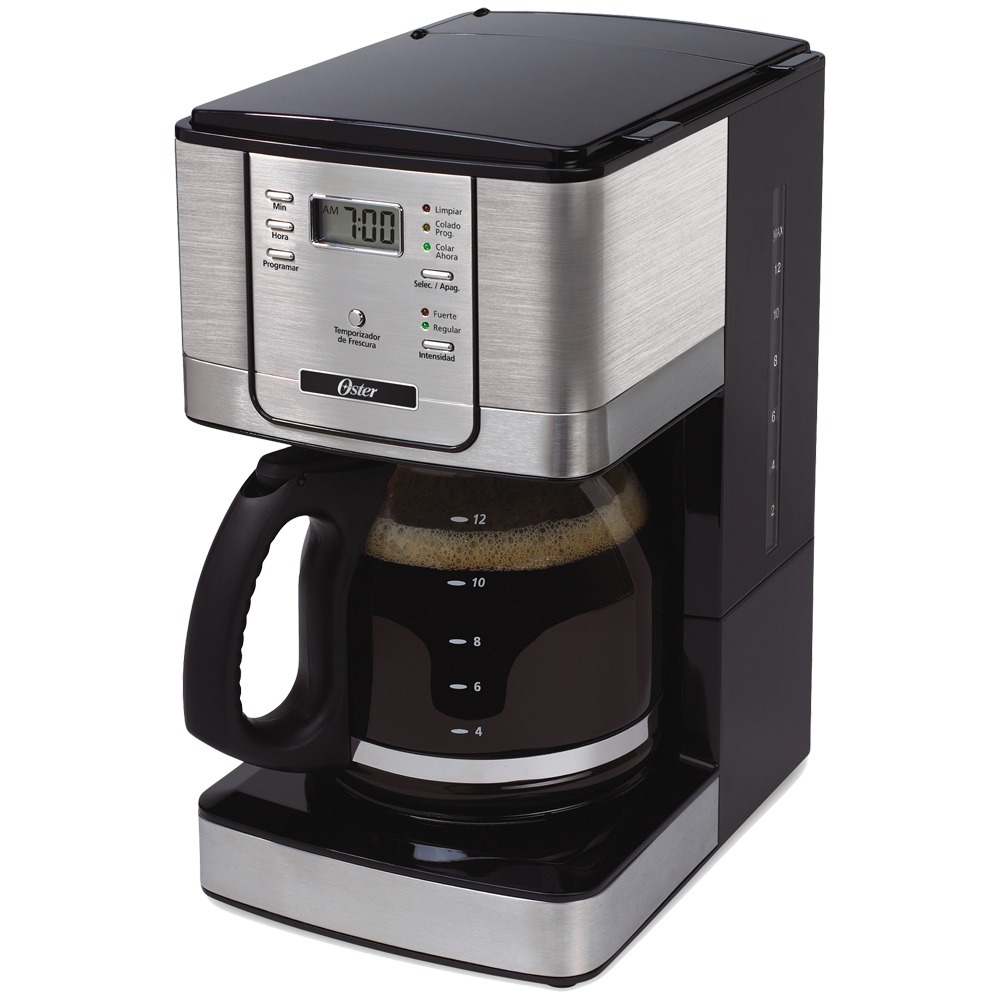 La cafetera de filtro Oster Timer 4401 tiene un moderno diseño con cuerpo en color negro y acero inoxidable, medidor transparente de agua y un práctico filtro lavable. Además, cuenta con una placa de control electrónico con display LCD.