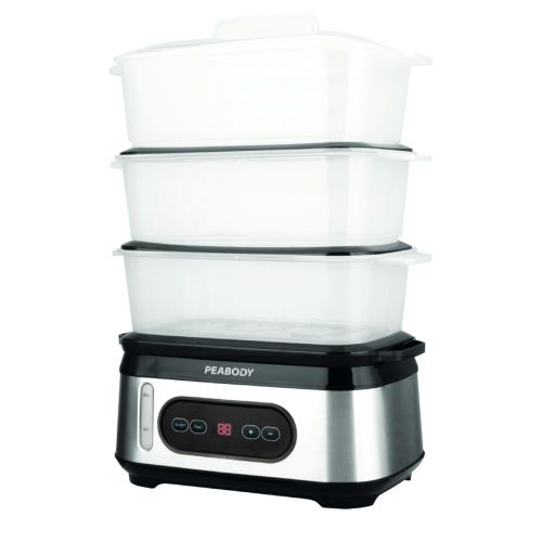 Descripción 9 Lts de capacidad (3lts cada compartimiento) Bowl para arroz de 1,5 Lts. Control digital. Depósito de agua de 1,8 Lts con indicador de nivel. Timer para programación de tiempos de cocción. Vapor instantáneo para cocción rápida. Cocción simultanea en 3 niveles. Inicio de cocción programable. Alarma sonora. Recipientes diseñados para fácil colocación y cocción de huevos. Incluye: 3 recipientes de cocción con sus soportes, 1 bowl para arroz, 1 tapa y 1 bandeja de condensación. Medidas (An x Prof x Al – mm): 337 x 195 x 456. Peso: 2.4Kg.